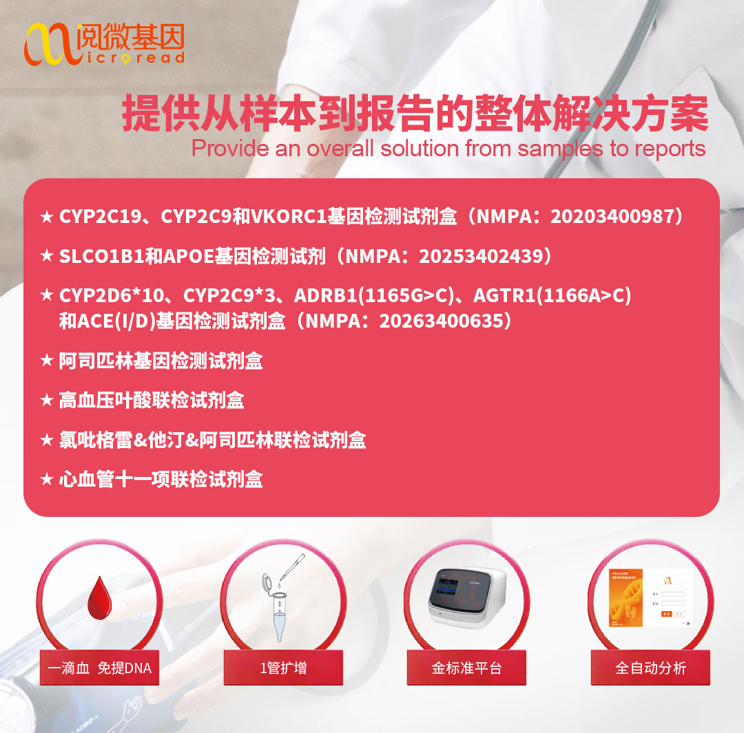 本试剂盒为国内首个基于PCR-CE(一代测序仪)方法获批的 5 项高血压位点联检产品,可体外定性检测人全血样本中相关基因多态性,精准指导 β受体阻滞剂、ARB、ACEI 三大类临床常用高血压药物用药方案制定,从基因层面为高血压精准医疗筑牢检测基础。 产品依托阅微基因核心技术打造,兼具免提取、一管扩增、全自动分析三大领先优势,实现高血压用药基因检测的高效化、精准化、便捷化,完美适配临床检测场景需求。至此,阅微基因精准用药产品矩阵布局已初步完成,同一平台可完成抗栓药物、降脂药物和降压药物的基因检测。