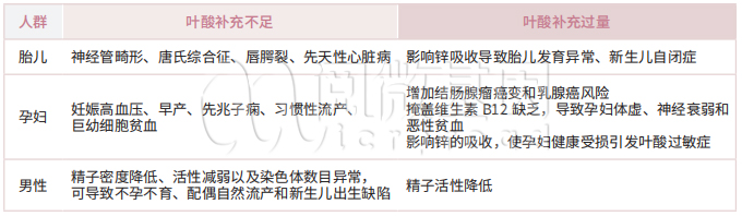 叶酸对人体生长发育发挥着重要作用,人体自身不能合成,必须从外界摄入;叶酸补充不足或利用能力差均会造成叶酸缺乏,导致皮肤色素沉着、唇炎、舌炎及高同型半胱氨酸血症等临床表现。孕妇缺乏叶酸会导致胎儿出生缺陷,孕妇自身也会出现很多不良症状。母体内的叶酸水平至少需要 12 周才能达到有效浓度,所以通常建议至少提前 3 个月来补充叶酸。
