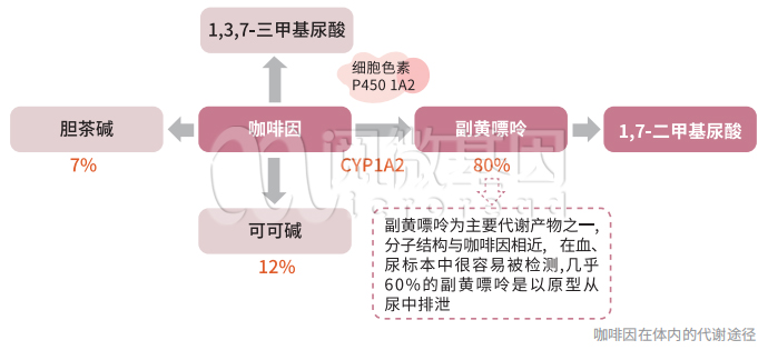 咖啡因是从植物中提炼出的一种生物碱,适度使用有提神的作用,饮料、咖啡、茶、可可、巧克力以及很多药物中均含有咖啡因。剂量过大或长期超量摄入对人体不利,可能造成心悸、精神紊乱、诱发骨质疏松等。咖啡因有成瘾性,停用可能出现精神萎靡、浑身疲软等戒断症状。咖啡因的代谢主要通过细胞色素氧化酶系统,细胞色素氧化酶 CYP1A2 基因承担着清除体内咖啡因的任务,但代谢效率的高低因人而异。