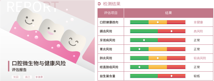 阅微基因与中科院微生物所合作,联合研发的口腔微生物与健康风险评估检测服务,是通过检测口腔唾液内菌群的分型(普雷沃氏菌、奈瑟氏菌属),以及有益菌(双歧杆菌、乳杆菌)和有害菌(变异链球菌、牙龈卟啉单胞菌、幽门螺杆菌、鲍曼不动杆菌、肺炎克雷伯菌、金黄色葡萄球菌、具核梭杆菌)的菌群丰度,来评估口腔健康趋势,以及龋齿、牙周病、胃炎、肺炎和结直肠癌的患病风险。从而科学指导口腔健康管理,远离疾病困扰。