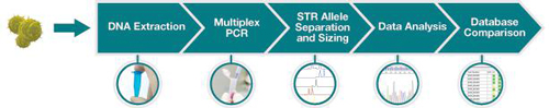 STR(Short Tandem Repeat,短串联重复序列)基因位点由长度为3~7个碱基对的短串连重复序列组成,这些重复序列广泛存在于人类基因组中,可作为高度多态性标记,被称为细胞的DNA指纹。STR已被广泛应用于亲子鉴定、个体识别、司法鉴定、交通事故鉴定和(造血干细胞)移植治疗后嵌合情况监测等领域。STR基因座位上的等位基因可通过PCR(聚合酶链式反应)扩增区域内重复序列的拷贝数不同来区分,在毛细管电泳分离之后通过荧光检测来识别,随后经过一定的计算方法 ,即可根据所得的STR分型结果与专业的细胞STR数据库比对,从而推算出样品所属的细胞系或可能交叉污染的细胞系名称。细胞STR分型检测已经成为目前最常用的细胞鉴定方法。