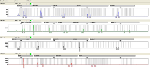 人源细胞的鉴定是通过检测21个基因座的STR分型来进行,人为二倍体,所以在每个基因座上最多会有两个信号峰出现,单峰代表纯合基因型,双峰代表杂合基因型。