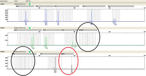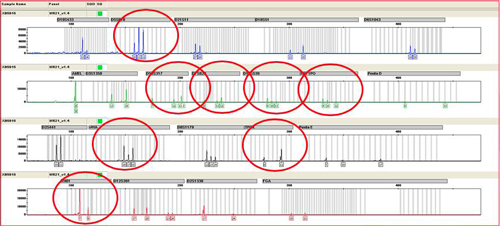 当人源细胞鉴定结果出现多信号峰(>2个峰)或信号峰比例失衡情况(红色圈标注),视为不正常现象,该现象出现的基因座数量大于等于三个时,认为此株细胞存在污染。