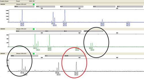 为了鉴定小鼠细胞中是否被人源细胞污染,我们在挑选基因座的时候,会同时涵盖小鼠基因座和人源的基因座(黑色圈标注)。正常鉴定结果应该是在鼠源基因座均起信号峰,人源基因座不起信号峰。由于小鼠细胞没有公认数据库,所以不能做到细胞种类的鉴定,但依然可鉴定样本是否为小鼠样本,或有没有存在污染情况。
