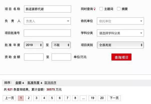 在科学网基金频道(http://fund.sciencenet.cn/)检索2019年国家自然科学基金中标情况,以“肠道菌群代谢”为关键词,查询到项目共621条,累计金额30575万元。中标项目涉及多个领域,在疾病肿瘤研究,中医中药研究、畜牧水产研究、食品科学研究中都均有涉及。可见肠道菌群与代谢组学的联合分析必然是今后肠道菌群研究中很重要的方向。