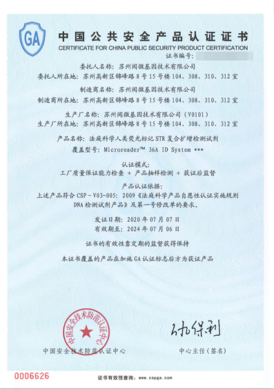 近日,阅微基因法庭科学人类荧光标记STR复合扩增检测试剂——Microreader™ 36A ID System顺利获得中国公共安全产品认证证书(简称GA证书)。