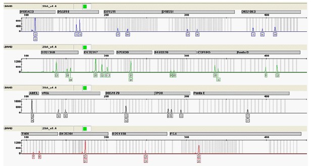 某肿瘤防治中心委托一株细胞鉴定是否存在交叉污染现象,我们采用20个基因座系统检测,如图所示: